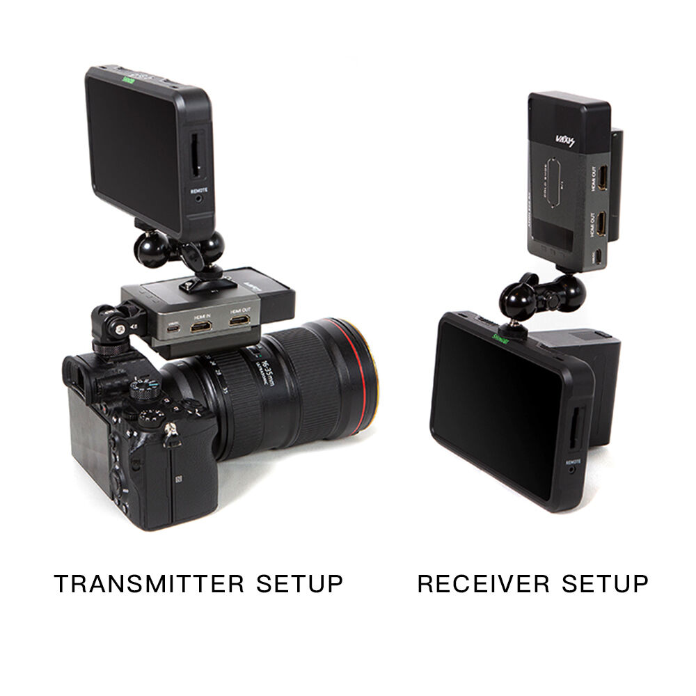 With the Basic Atom 500 HDMI Wireless HD Video Transmission Kit from Vaxis you can transmit visually lossless, video signals to the Vaxis receiver with less than 1 ms latency. The transmitter sends a powerful line-of-sight signal up to 500' and it can also multicast via Wi-Fi to up to three mobile devices for monitoring.