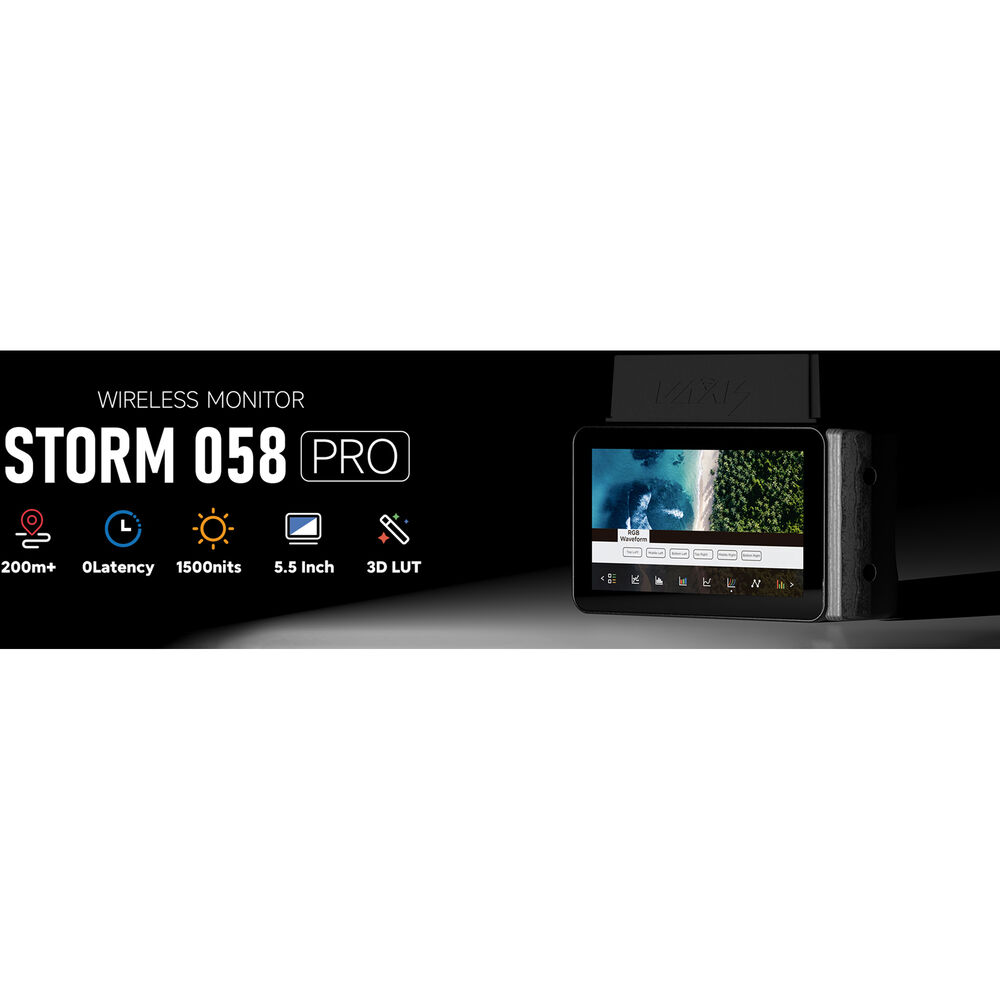 Receive and monitor high-quality wireless video transmissions using this compact Storm 058 Pro 5.5" Wireless Touchscreen Monitor from Vaxis. The Storm 058 Pro can receive up to 1080p60 video from up to 656' away with zero latency using its built-in antennas. It features a built-in side grip for comfort and durability for mobile director and AC monitoring.