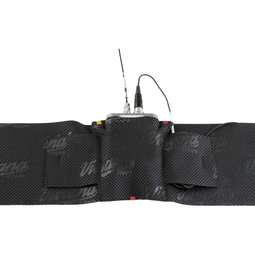 The large strap is 45" in length (unstretched) and features an overlap hook-and-loop fastener that provides a snug fit, while staying invisible under the talent's clothing. The universal pouch stretches to hold small and large transmitters and is also equipped with a hook-and-loop strip to keep the transmitter securely in place, even in demanding situations.