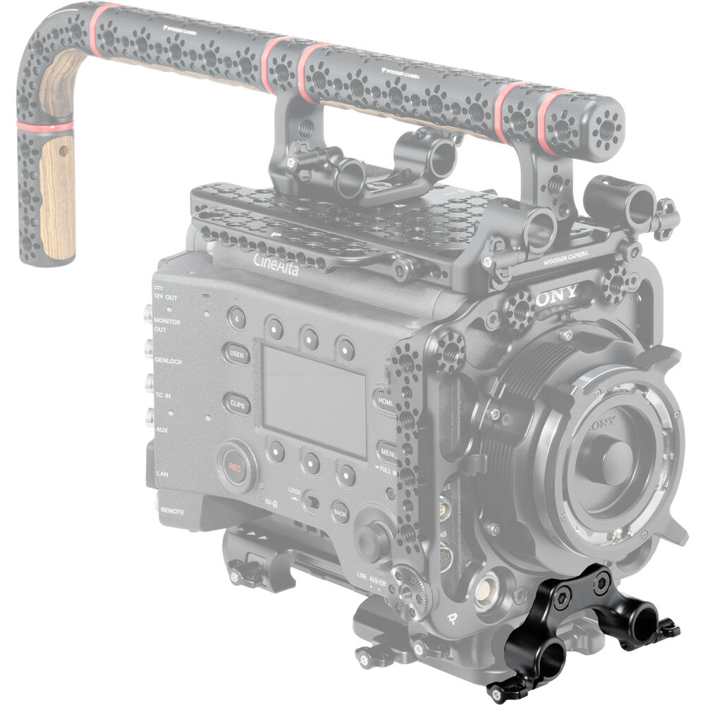Integrate 15mm rods into your Wooden Camera Faceplate Cage System using this 15mm Dual Rod Clamp. The clamp mounts to two specific mounting points on the Faceplate Cage centered beneath the lens mount of your Sony VENICE series camera. This allows for the integration of rod-based lens accessories like follow focus systems or matte boxes with perfect placement.