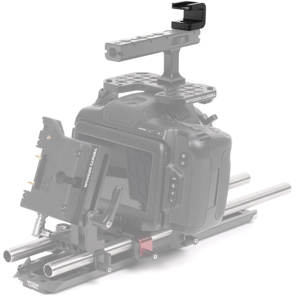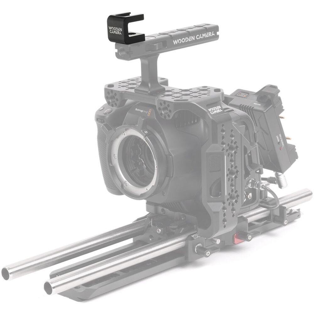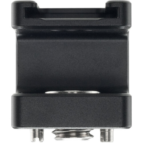 This Wooden Camera Cold Shoe Riser Bracket attaches to any 3/8"-16 mounting point and features removable locating pins for added security. It provides a standard cold shoe mount raised 23mm vertically from the center of the 3/8"-16 screw. Great for mounting on-camera lights, microphone shock mounts, and other accessories.