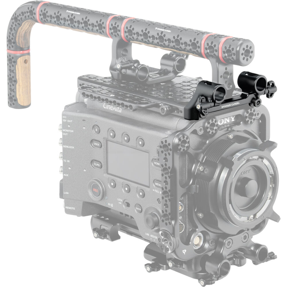 This Front 15mm Dual Rod Clamp from Wooden Camera is designed to attach to the front of the quick release top plate for your Sony VENICE/VENICE 2/Rialto/Rialto 2 and provide upper 15mm rod clamps for accessory integration. Mounting threads at the bottom of the clamp line up with the threads on the top plate for optically centered orientation. Integrate rod-based accessories such as battery plates and follow focus controls.
