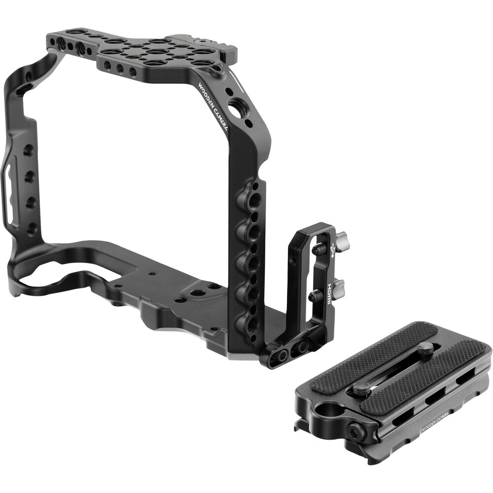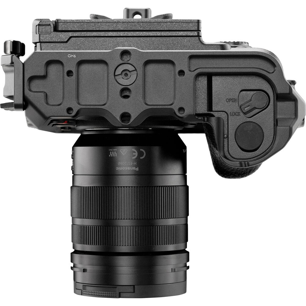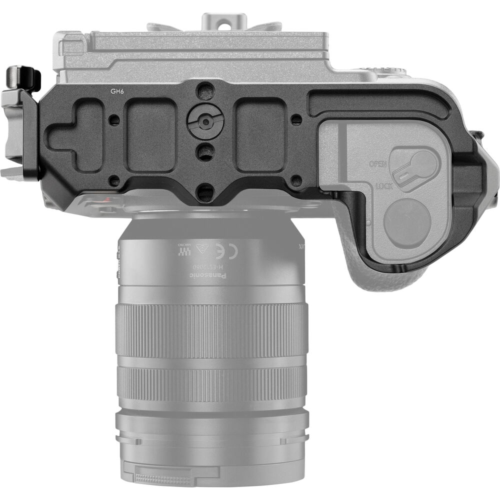 The cage features a detachable HDMI/USB cable clamp on the side to reduce strain on your HDMI and USB cables and ports on your GH6. On the base, an Arca-type dovetail allows you to mount the cage onto a separately available Arca-type receiver, and it features a quick release plate to quickly mount and unmount the cage. Engraved markings indicate the focal plane of the camera, and location tabs ensure your camera is positioned correctly within the cage.