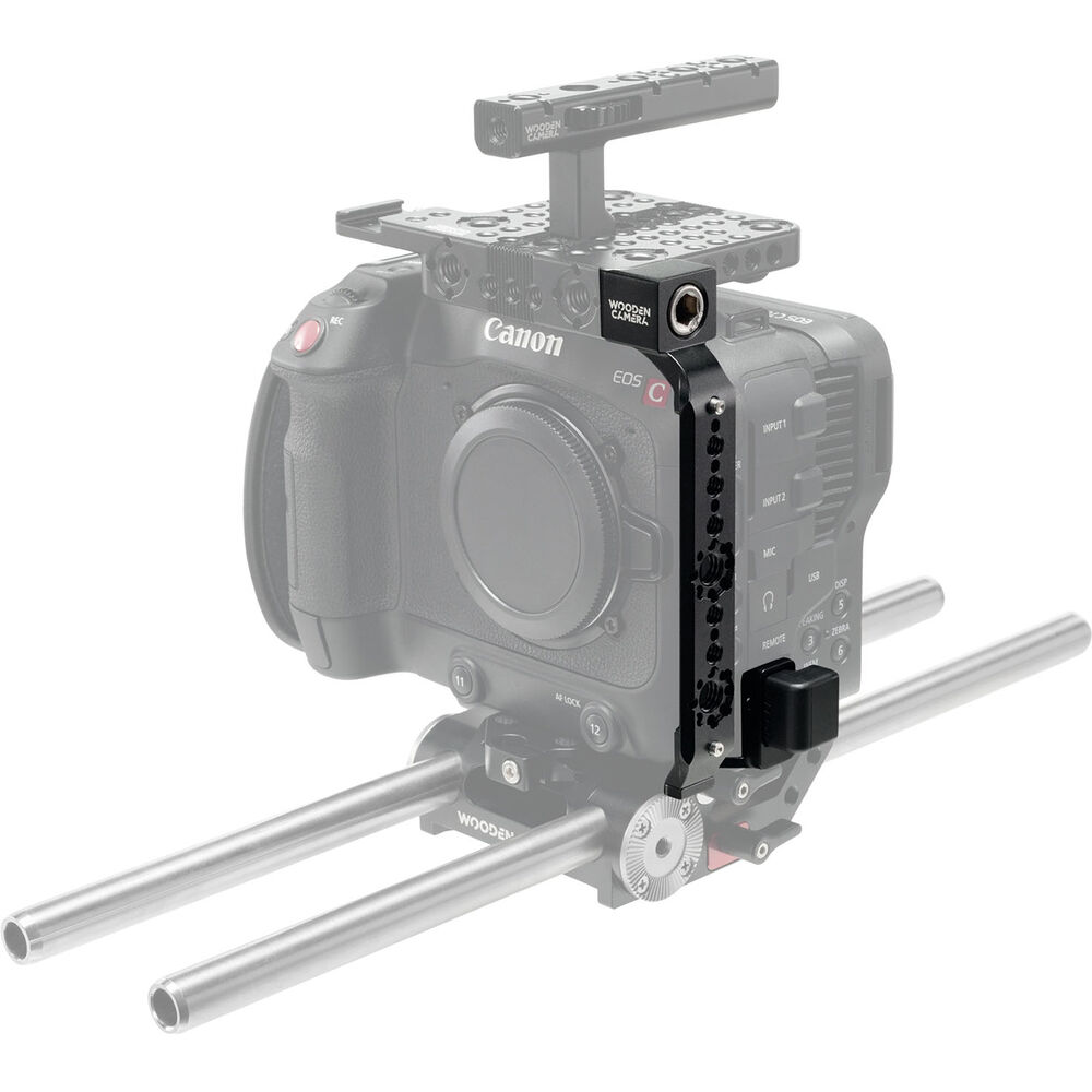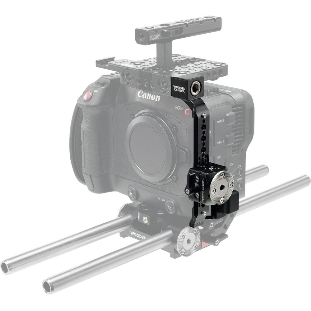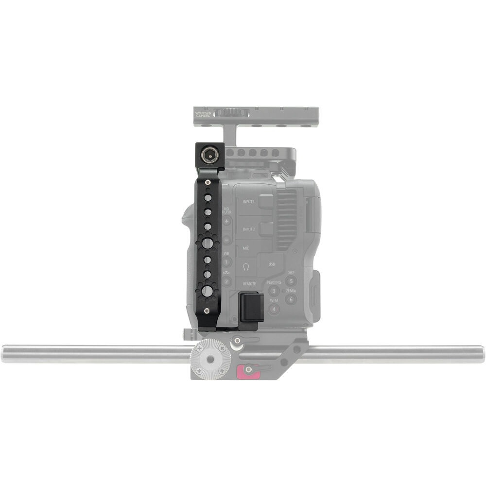The Left-Side NATO Safety Bracket for Canon C70 from Wooden Camera offers protection, a detachable cable clamp, and multiple accessory mounts for your camera. This cage component mounts on the separately available Top Plate for C70. The bracket incorporates a NATO rail with safety pins on both ends, five 1/4"-20 threads, and two ARRI-style 3/8"-16 threads for attaching accessories such as handgrips.