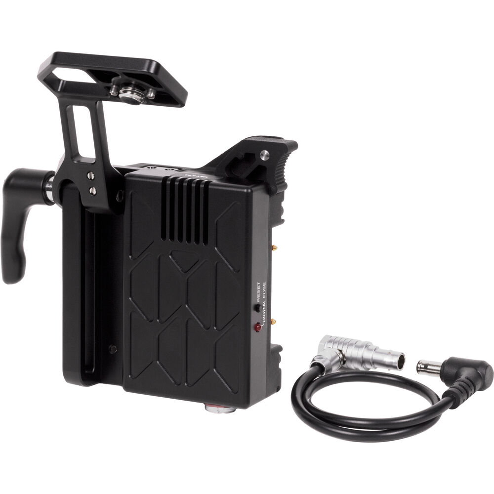 The compact battery slide mounts onto a rig using its integrated 3/8"-16 mounting screw. It also features two 5.8V D-Tap outputs for powering accessories. The D-Tap accessory outputs feature a digital fuse that monitors each D-Tap port and disables it if it exceeds the set current for accessories, leaving the camera running without interruption. Once the load has been reduced by removing accessories, a reset button can be pressed to enable accessory power again.