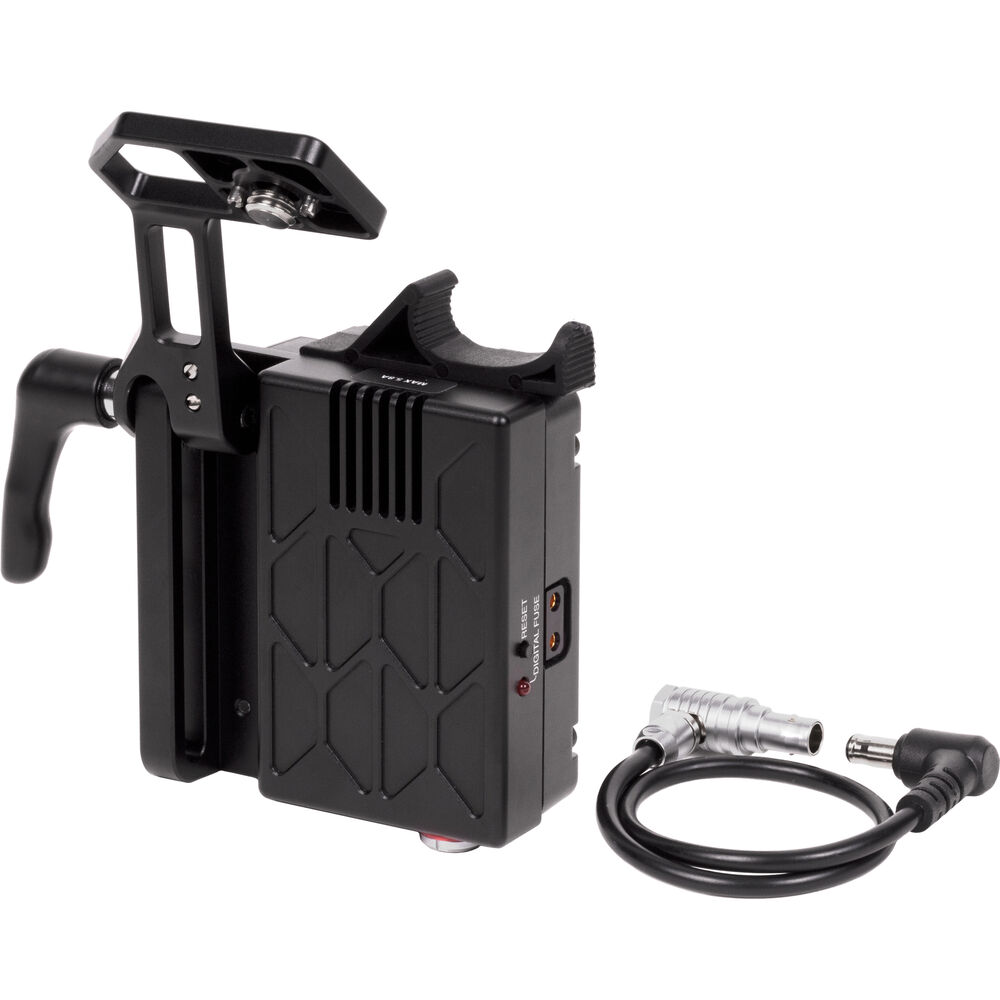 The compact battery slide mounts onto a rig using its integrated 3/8"-16 mounting screw. It also features two 5.8V D-Tap outputs for powering accessories. The D-Tap accessory outputs feature a digital fuse that monitors each D-Tap port and disables it if it exceeds the set current for accessories, leaving the camera running without interruption. Once the load has been reduced by removing accessories, a reset button can be pressed to enable accessory power again.