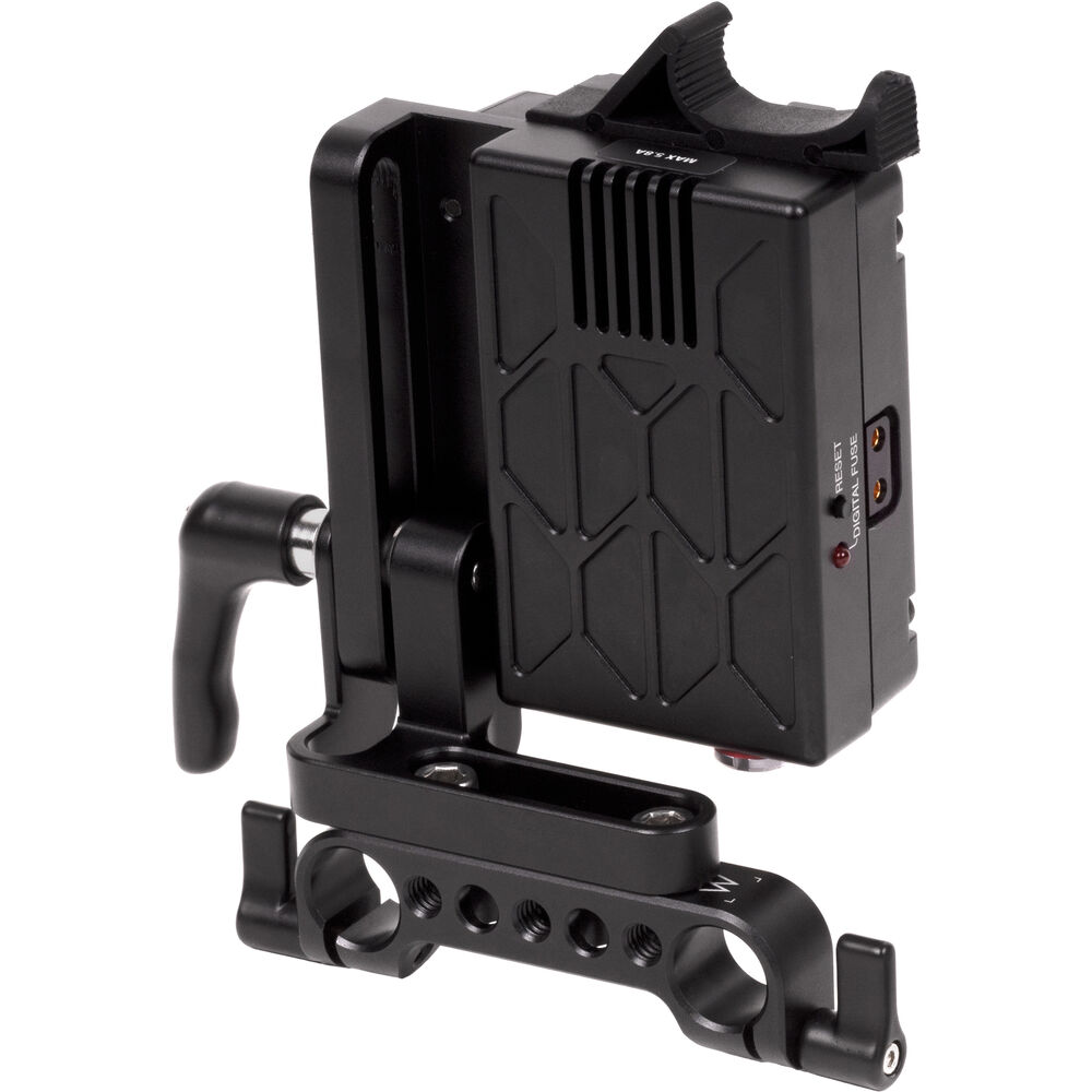 The Micro Battery Slide Pro attaches to the 15mm LW rods on your rig with its integrated rod clamp and can be adjusted for optimal positioning to reduce strain on the power connections. A digital fuse within the power device cuts off the accessory outputs if the user exceeds the set current while keeping the camera output active. Once the accessories are reconfigured, the reset button can be pressed and the outputs will be restored.