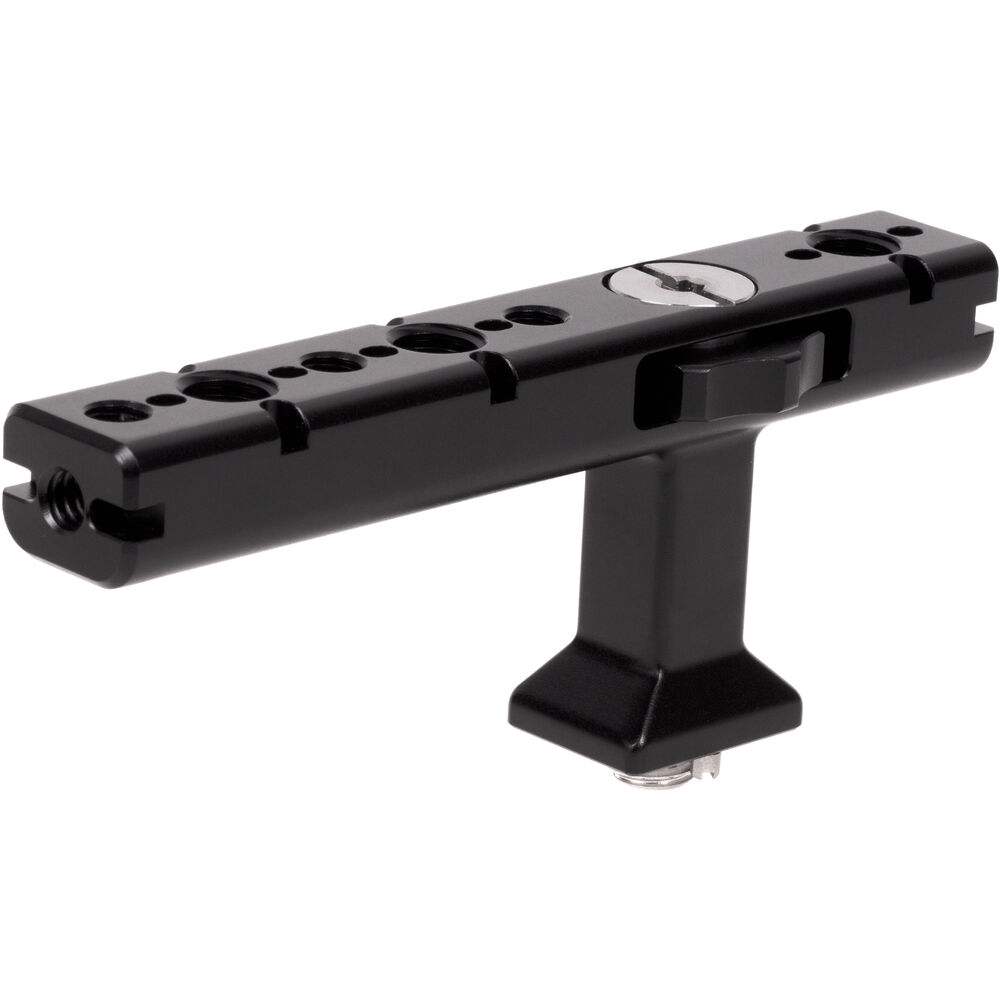 Add a compact top handle to your camera cage or rig using the 4.3" Mini Top Handle from Wooden Camera. This lightweight handle mounts on your rig via a captive 3/8"-16 screw with detachable ARRI-standard, anti-twist locating pins. The versatile screw mount is attached with an easy-to-use thumbwheel, and it can be further tightened using a flat head screwdriver or either a 5/32" or 4mm Allen key. This aluminum handle features numerous 1/4"-20 threads and 3/8"-16 ARRI-style mounts for attaching a variety of camera accessories.