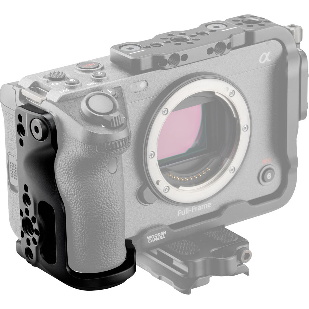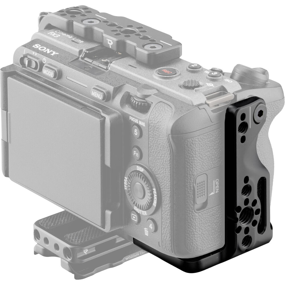 Attach this Wooden Camera Right-Side Handgrip to your Sony FX3 or FX30 camera and expand the mounting points of your rig. The handgrip wraps around the camera's preexisting handgrip and has a pass-through slot at the bottom so it can remain attached when you swap your battery. One 3/8"-16 thread and three 1/4"-20 threads offer mounting points for articulating arms or cable clamps. Three mounting screws secure the handgrip to your camera.