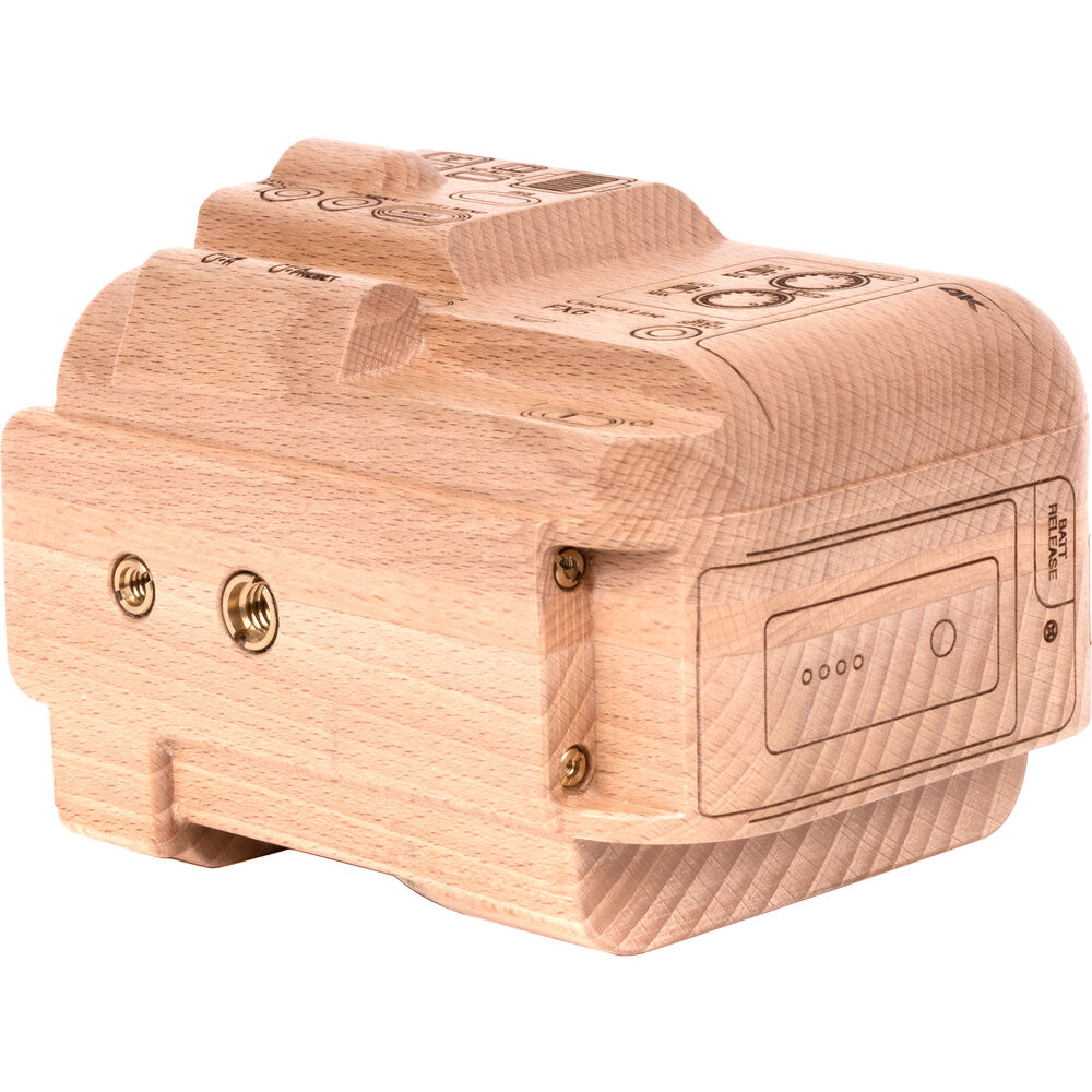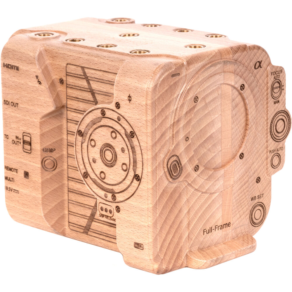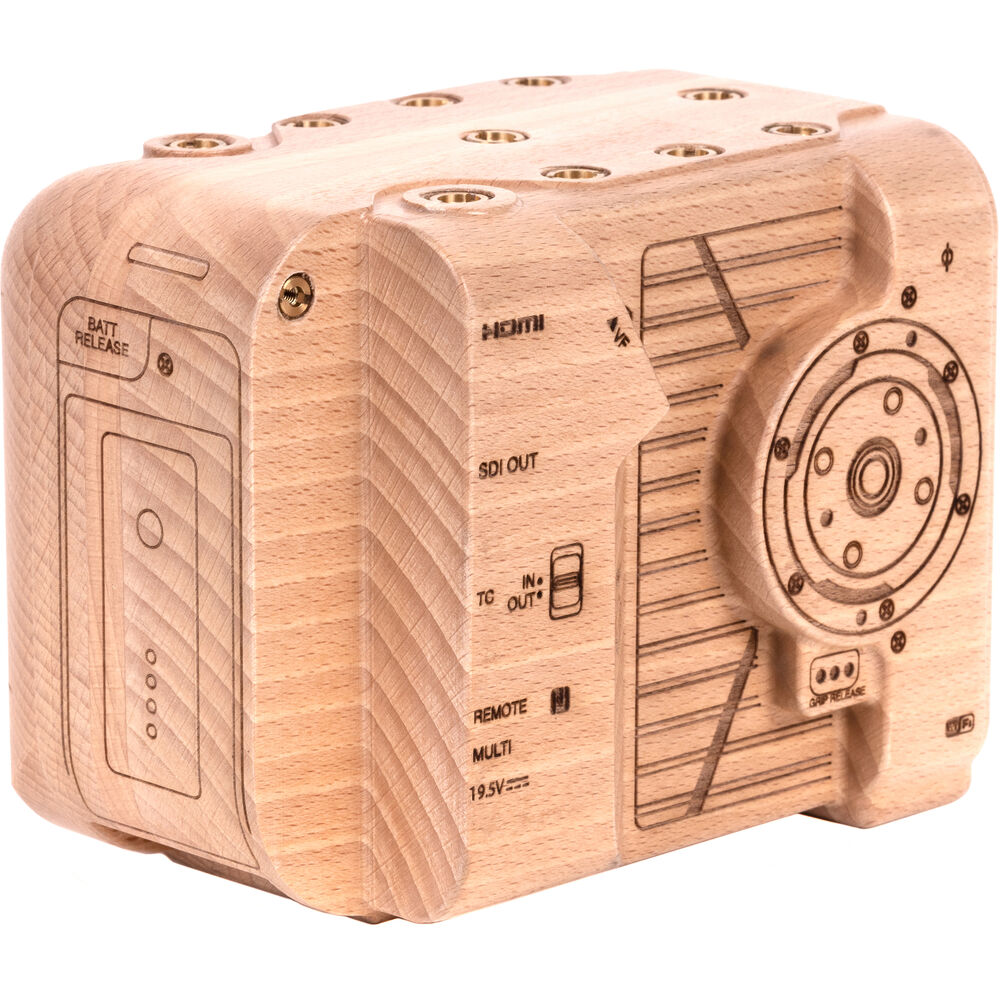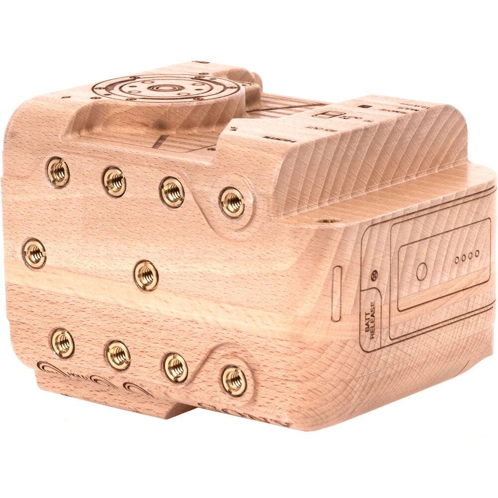 Designed as an accurate replica of the camera's overall form factor, this wooden model is embellished with markings of where buttons, switches, and dials would be, along with representations of the lens mount and most of the mounting points. It has ten 1/4"-20 threads on top and two M3 threads on the back, as well as one 1/4"-20 and one 3/8"-16 thread on the bottom to mount a variety of accessories such as top plates, bottom plates, side plates, extension arms, or brackets.